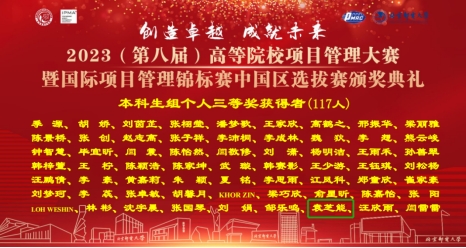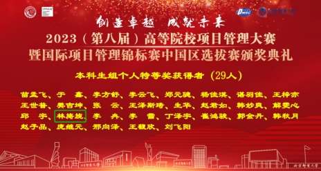 5月28日,由中国优选统筹法与经济数学研究会、国际项目管理协会主办的第八届全国高等院校项目管理大赛暨国际项目管理锦标赛中国区选拔赛成功落下帷幕。成人影视 工程管理专业学生袁芝能、林旖旎、张浩叶、吴惠所组团队荣获本科生组团队二等奖。同时,林旖旎和袁芝能两位参赛选手还分别斩获大赛本科生组个人特等奖和个人三等奖两项殊荣。