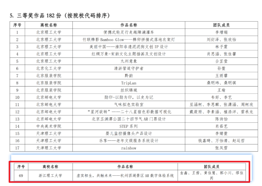 麻欣瑶、胡广老师指导的研究生项目《虚实相生,共触未来一一杭州西湖景区 AR 数字体验系统》荣获全国三等奖,这也是学院“红筑未来”AR工作室的成果。