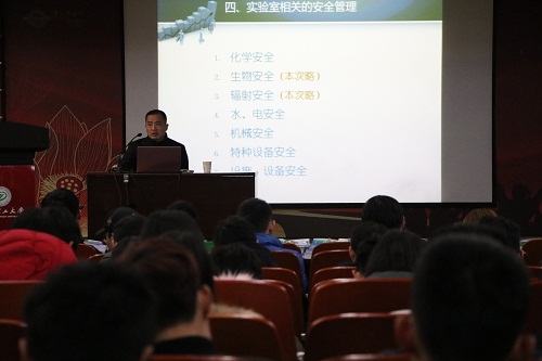 在国际会展中心三楼报告厅举办了师生安全报告会暨实验室安全责任书签订仪式。保卫处李赞颂老师受邀做了“校园安全与防护”的报告,学院各实验室主任、实验室管理员、各研究生、本科生班干部及学生代表参加了此次会议,报告会由吴大志副院长主持。