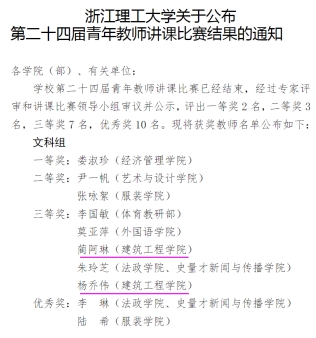 比赛前的抽签环节两位老师分别抽到第二位和最后一位。虽然出场顺序不是很有利,但两位老师依然以精彩的课堂设计、沉稳熟练的讲授技巧、生动形象的语言、条理清晰的说课稳定发挥,充分展现了建工青年教师的教学风采。最终,经评委专家现场打分,蔺阿琳、杨乔伟老师均获得本次讲课比赛的三等奖。