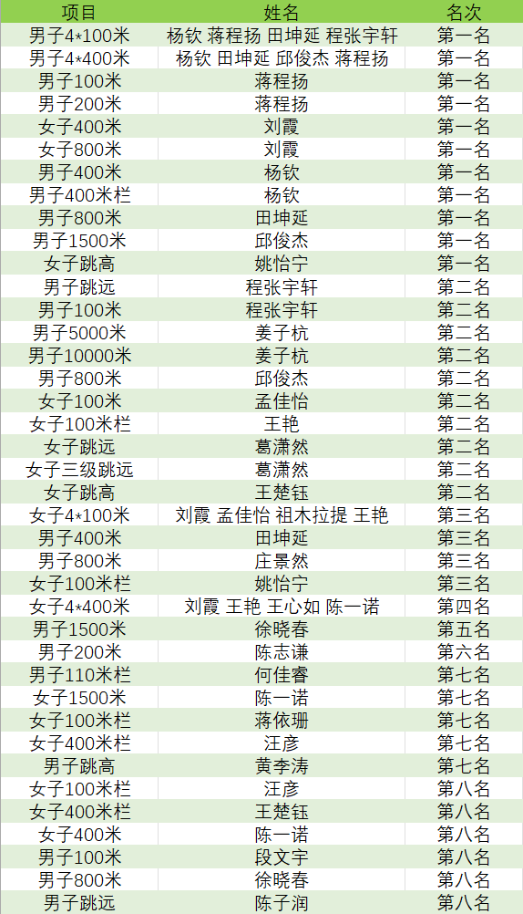 运动员各类奖项前八名获奖名单