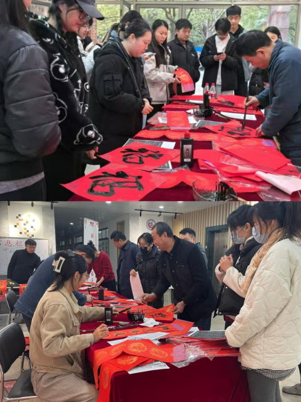 此次活动邀请了浙江省书法家协会教育委员会委员程惠池和学院工程管理系年轻教师徐书缘一起为大家现场书写新春对联。活动现场气氛热烈,长桌上铺开了鲜艳的红纸,笔墨飘香,两位书法老师挥毫泼墨,笔法娴熟,行笔如流水,一张张“福”字、一幅幅春联跃然纸上,年味浓浓。