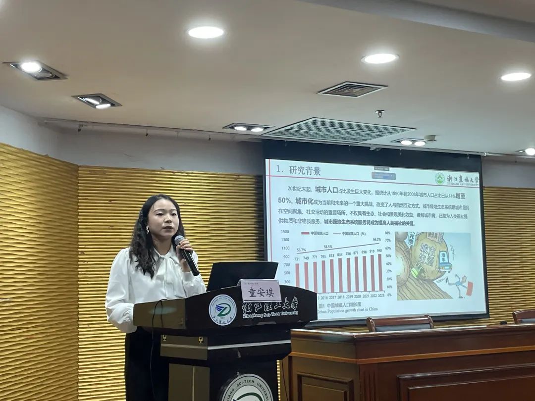 浙江农林大学风景园林与建筑学院童安琪硕士汇报了《城市绿地生态系统服务与人类福祉关系研究综述》,从多角度介绍了城市绿地生态系统服务的重要性,指出绿地生态是实现人类福祉的关键。
