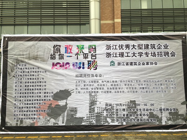 邀请,浙江省建筑企业家协会在我校学生活动中心举办“2016年浙江优秀建筑企业大学生专场招聘会”。全省建筑专业相关企业15家到场参加,提供了26个专业方向的就业和实习岗位200余个,吸引了众多大三大四同学的参与。
